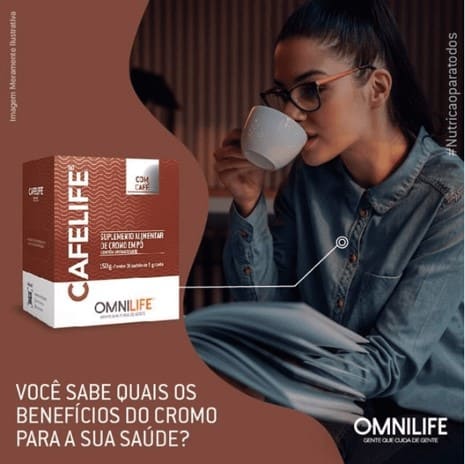 Cafelife Evolução da Omnilife é um pó com grãos solúveis de café, enriquecido com cromo e inulina, uma fibra alimentar dietética.